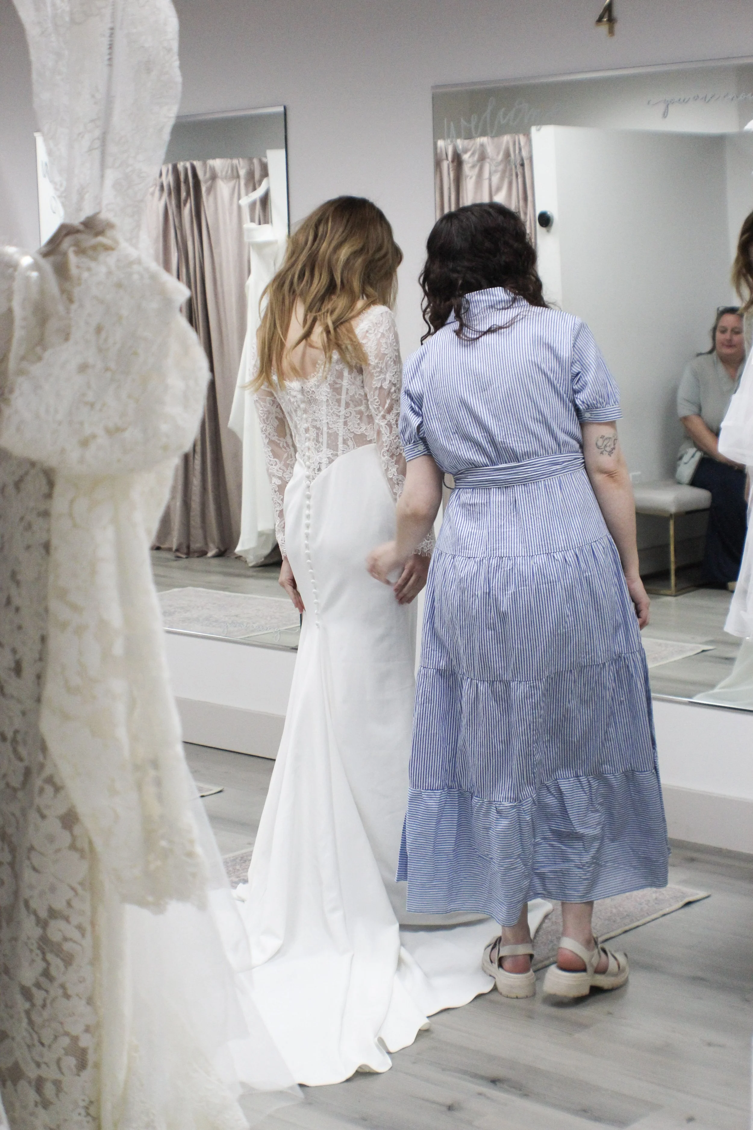 After you pick out your first few dresses we’ll head to the dressing room & then comes the fun part, it’s time for the try-on! You’ll find the appointment slows down as it goes but then initial try-on moves quickly. We want to know if you love it or not! We move quickly so we can spend time in the ones we love, we dont need to worry about those we dont! If we love it, it stays in the room. If we don’t it goes back on the rack!